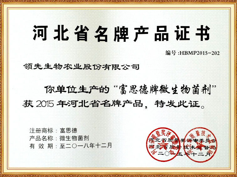 富思德牌微生物菌剂—河北省名牌产品证书