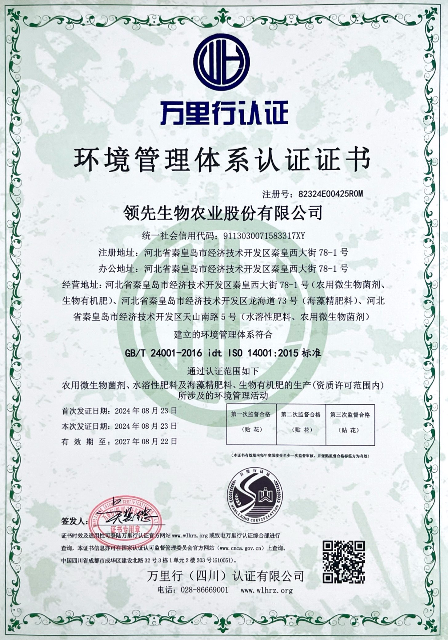 环境管理体系认证证书